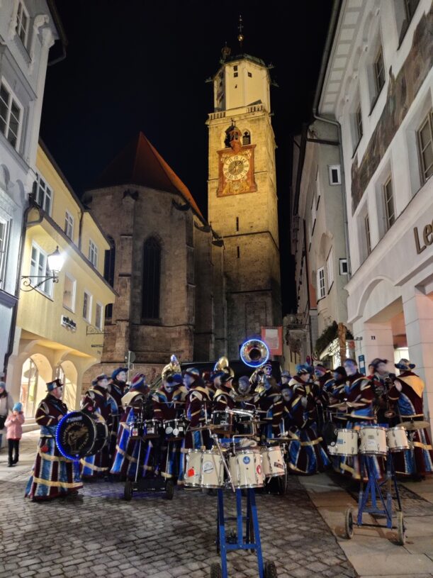 Die Luft bebt, der Rhythmus reißt mit, lange schon, bevor man sie sieht: Die Hausemer Guggenmusik kommt von der Kalchstraße, die Isnyer Guggenmusik vom Weinmarkt, die Guggenmusik AllgäuLongDongs von der Ulmer Straße: Es ist Guggenmusik-Nacht mit Monsterkonzert in Memmingen. Nach und nach ziehen prächtig gekleideten Guggenmusik – Kapellen mit ihren Bässen, Schlagwerk, Trompeten, Posaunen und Sousaphonen auf den Marktplatz. Tausende Menschen tanzen auf dem Marktplatz: Nun hat auch die letzte Kapelle ihren Platz auf den mitschwingenden LKW-Hängern gefunden. Die mittelalterlicheStadtbebt!
